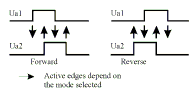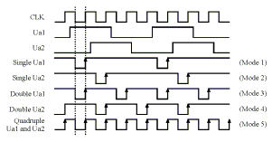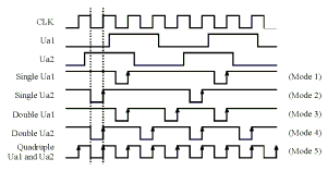 [Next] [Previous] [Up] [Top] [Contents] [Back] 3.2.5 Mode Description 3.2.5.2 Direction Discriminator Modes 1 to 5A channel's quadrature signals Ua1 and Ua2 identify forward or backward directions. If Ua1 leads Ua2, the forward direction is indicated and the counter will count up. If Ua1 lags Ua2, the reverse direction is indicated and the counter will count down.