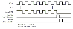 [Next] [Previous] [Up] [Top] [Contents] [Back] 3.2.5 Mode Description 3.2.5.3 Pulse Width Measurement Mode 6In this mode Ua1 gates the pulse width to be measured. When synchronized with the clock edge after a low to high transition in Ua1, counting begins at the input clock frequency of 10 MHz. Similarly, when synchronized with the clock edge after a high to low transition of Ua1, counting is disabled. The value in the counter is stored in the Channel Counter Output Register and the counter is cleared. If Ua2 is held high the counter will count up, and if Ua2 is held low the counter will count down.